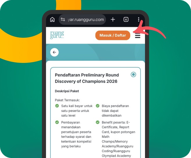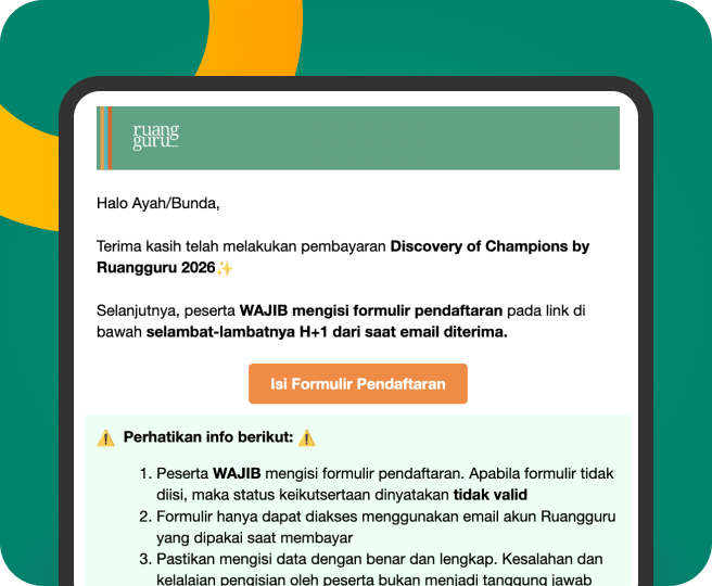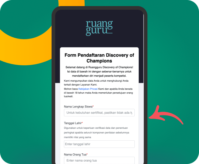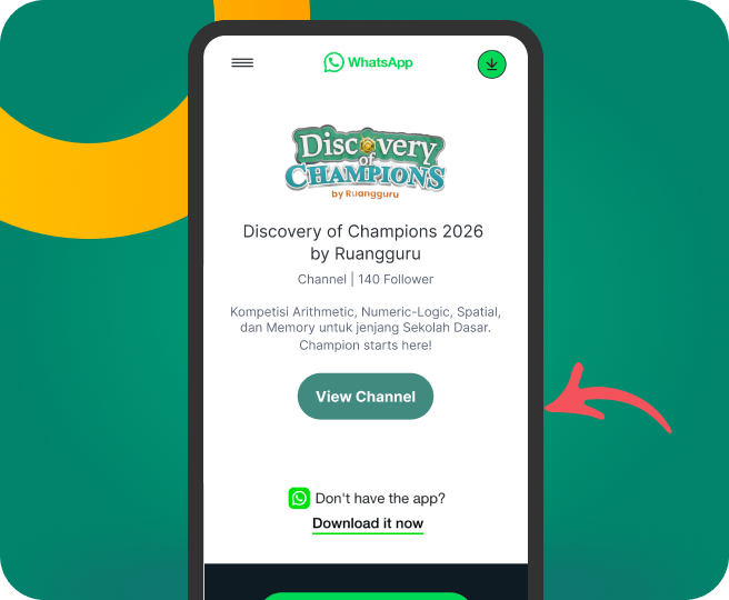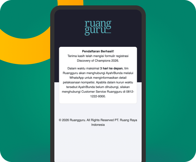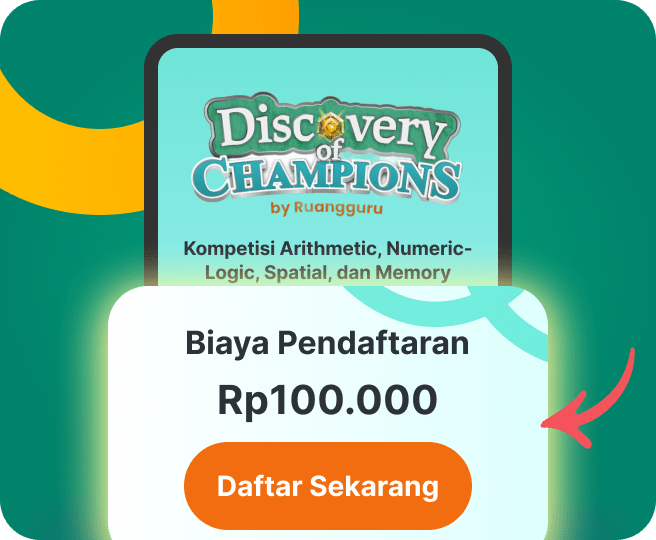Discovery of Champions by Ruangguru 2026 adalah kompetisi yang menguji 4 Champion Skills anak, yaitu kemampuan Memory, Arithmetic, Numeric-Logic, dan Spatial melalui seleksi berjenjang mulai dari sekolah, kabupaten/kota, provinsi/region hingga nasional.