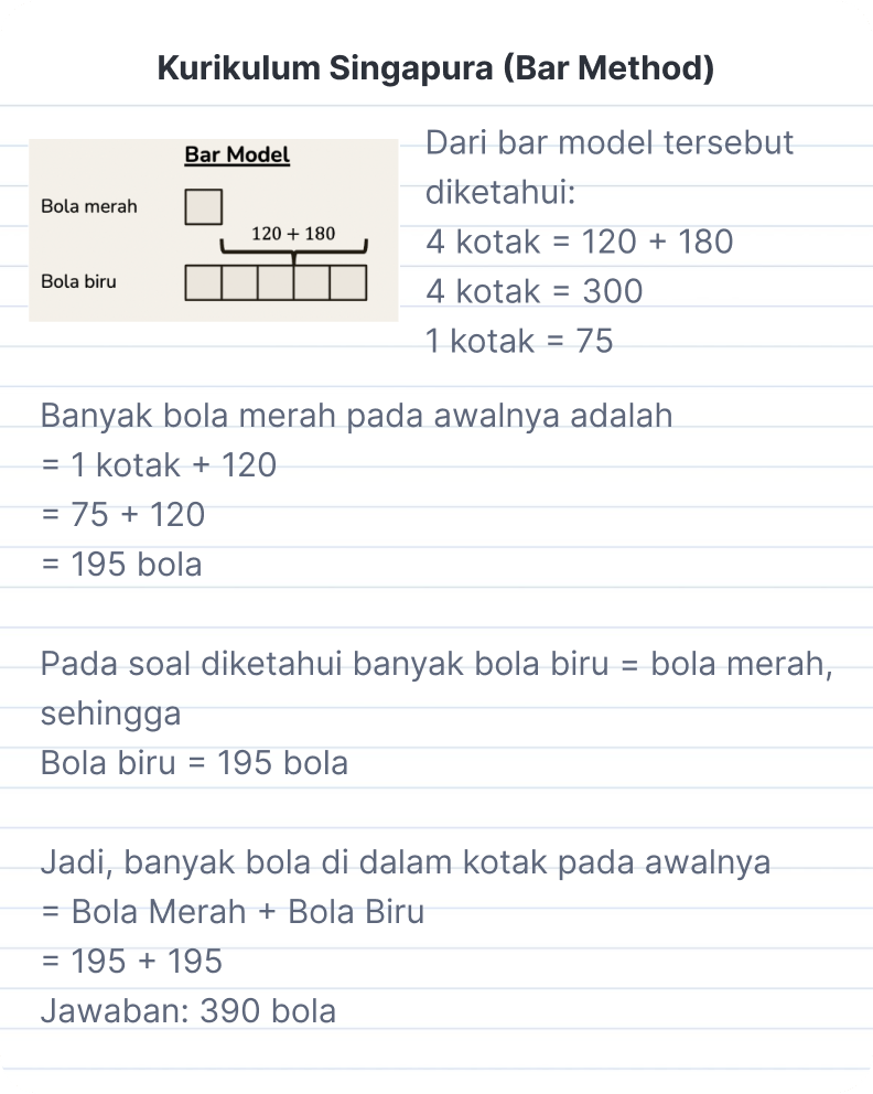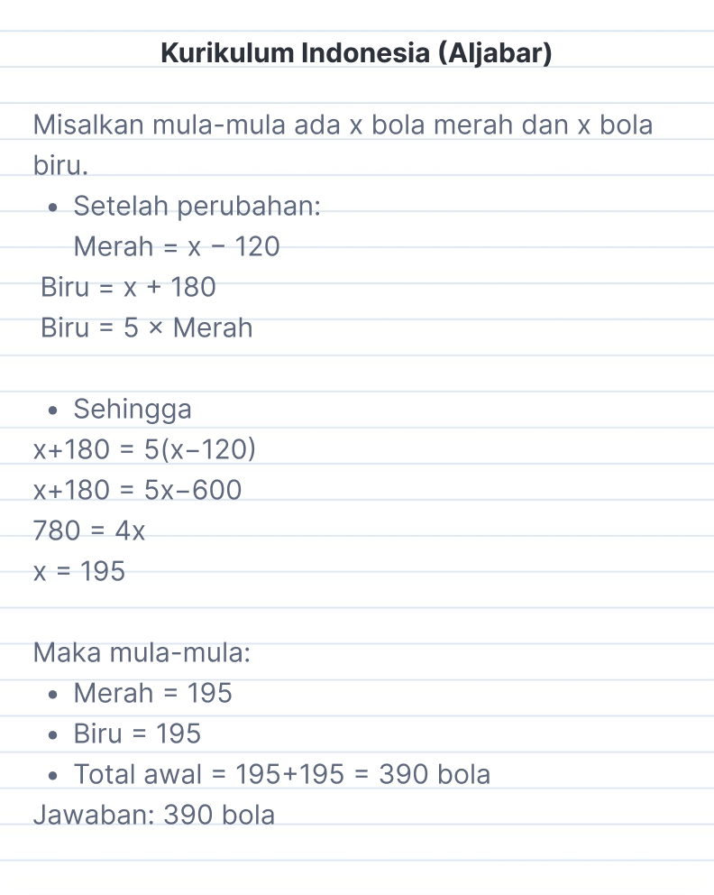 Sebuah kotak berisi bola merah dan bola biru dengan jumlah yang sama banyak. Setelah 120 bola merah diambil dan 180 bola biru ditambahkan , jumlah bola biru menjadi 5 kali jumlah bola merah. Berapa banyak bola di dalam kotak pada awalnya?